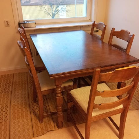 Finns några repor/skador på bordet, se foto. Stolarna i fint skick, kan vara lite färg som saknas/skavts på benen men i övrigt hela och rena.