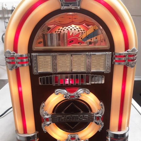 Radio med kassettspelare. Utsida designad i nostalgisk katedral stil som efterliknar en antik rörradio från 1930-talet.