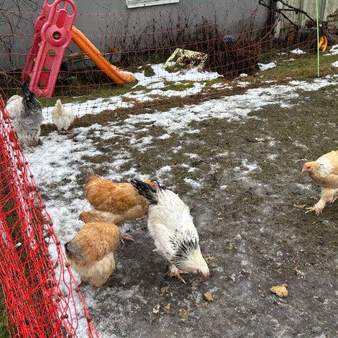 Höns flock med blandade färger och raser. Passar för äggproduktion och som husdjur. Kan hållas utomhus i inhägnad. Och en tupp