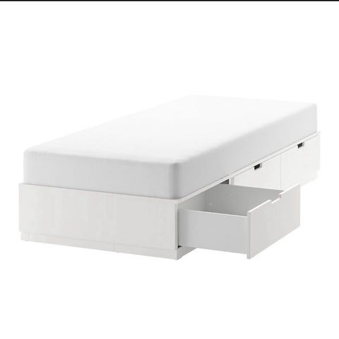 Vit säng med utdragslådor under själva sängen. Mycket praktisk. Madrass ingår. Bredden är själva sängstommen. Hämtas senast söndag 25 januari.