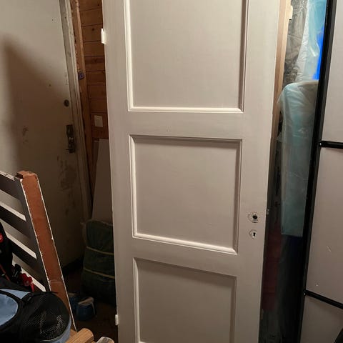 Innerdörr i trä med vit färg. Dörren har paneldesign och är avsedd för inomhusbruk. Träramen finns kvar.