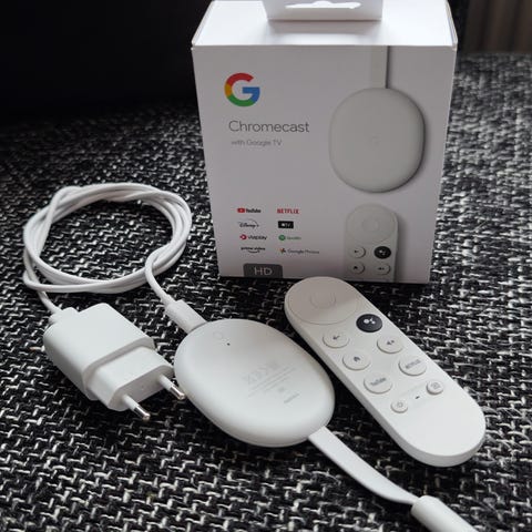 Google Chromecast med Google TV är en streaming-enhet i vit färg som ansluts via HDMI för att strömma media till TV. Enheten levereras med fjärrkontroll och USB-kabel för strömförsörjning.