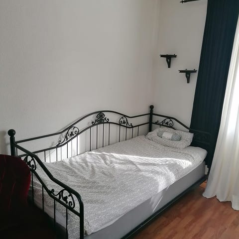 IKEA dagbädd i vit färg med integrerad förvaring under sängen. Passar som en enkel- eller extrasäng och kan placeras i olika rum för flexibel användning. Med måtten 80x200 men kan bli till en dubbelsäng. Använt i 3 år