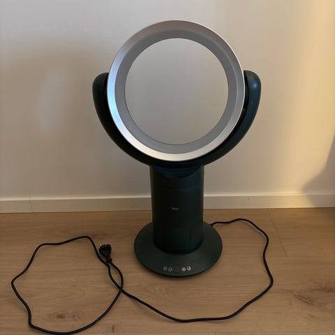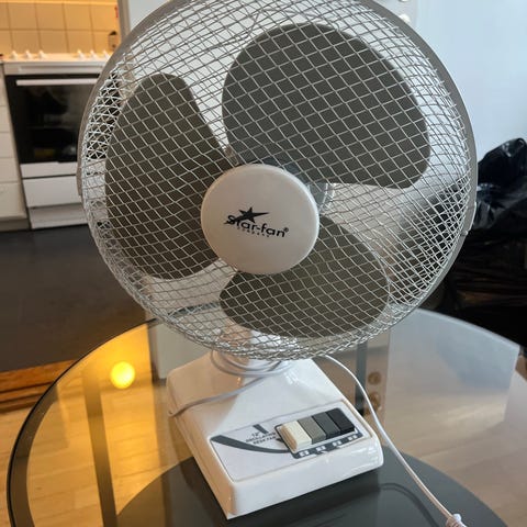 Bordsfläkt i vitt, avsedd för användning på bord eller liknande ytor. Fläkten har ett skyddsgaller i metall och en elektrisk anslutning med sladd och kontakt för nätström.