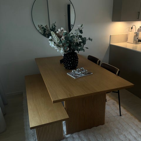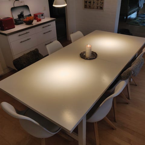 Färg vitpigmenterad, massiv oljad ek från Ilva. Förvaring finns i bordet, två lådor som dras ut. Även här man lägger de två iläggsskivorna som ingår, som förlänger bordet med ca 100 cm. Då kan 14 personer få plats. Ingår gör också den träolja vi använt från Ilva, så ni vet vilken som ska köpas in för framtida oljning.