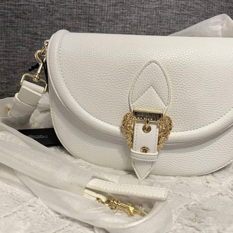 Versace Jeanse Couture Axelremsväska tillverkad i läder, designad för kvinnor. Väskan har en bärhandtag och en avtagbar axelrem, vilket ger flera bärmöjligheter. Den är utrustad med en dekorativ spänne på framsidan.