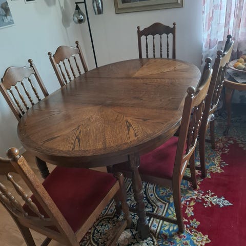 Finns märken på bordet så behöver slipas & oljas, små gnagmärken finns på stolarna efter valp.