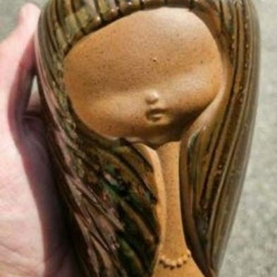 Kanna i keramik med handmålat motiv föreställande ansikten och figurer i olika färger. Kannan har ett flätat handtag och en öppning för påfyllning. Passar för att servera drycker.
