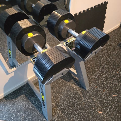 Nüobell är ett justerbart hantelset som ersätter flera fasta hantlar i ett kompakt format. Varje hantel kan justeras från 2 till 32 kg, vilket ger totalt 16 viktsteg per hantel. Viktjusteringen sker genom att vrida greppet, utan behov av att montera eller ta av lösa viktskivor.