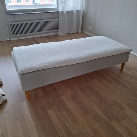 Fin säng Ikea skårer 90x 200 m ben i metall. Mjuk. Bäddmadrass finns. Ok skick.
