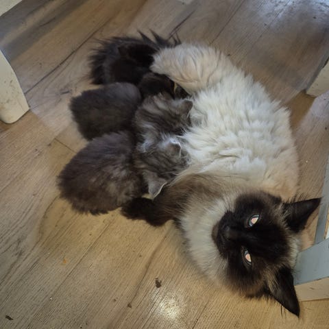 Mamman är Ragdoll och skogskatt blandning, pappan är skeppskatt.
