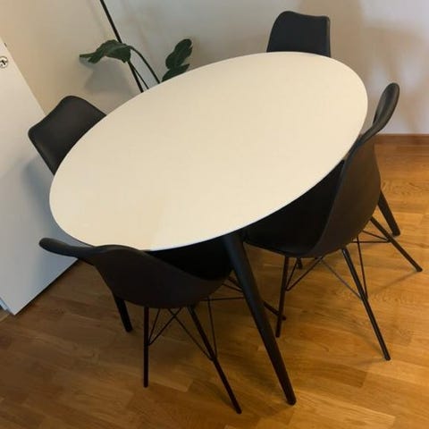 Bordet har utgått från Soffadirekts sortiment. Stolarna är super sköna och stabila, men tyvärr väldigt slitna, så de medföljer i priset. Kan man bara klä om dom så är de toppenstolar!