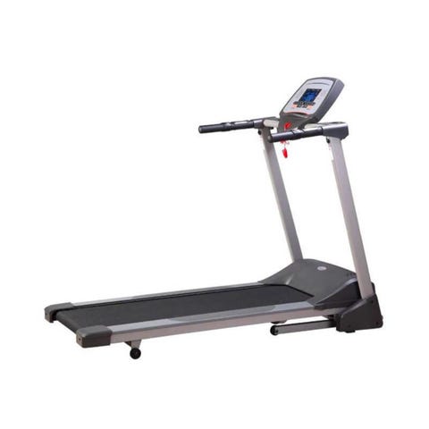 Löpband i svart och grå färg. Utrustad med handtag och display för träningsinformation. Passar för inomhusträning och löpning.