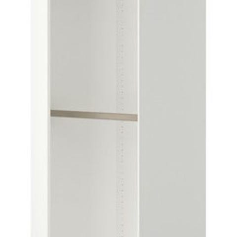 Två vita garderobsstommar för gångjärnsdörr. Det finns även sex stycken hyllplan och klädstång.