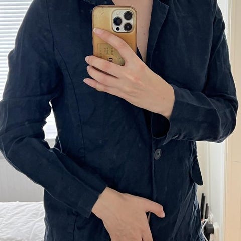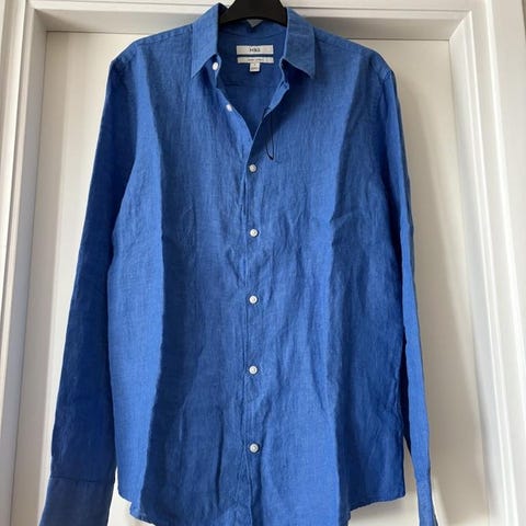 Säljer min fina linneskjorta. En knapp har trillat av, den längst ner. Tyckte inte det märks när man har på sig att det den. Brukar använda den öppen som en over-shirt