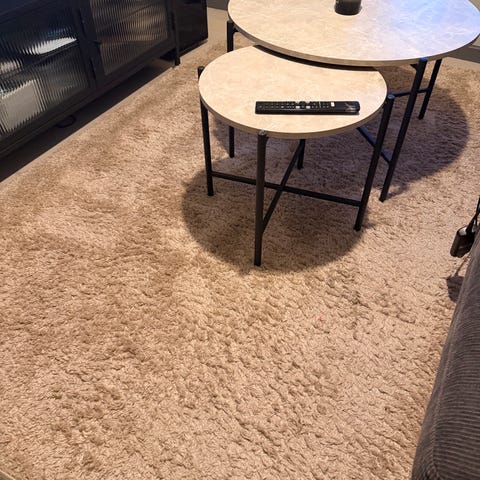 En brun/beige rund matta. Den är nyss öppnad och vi säljer den då storleken är för liten. Storleken är 240cm