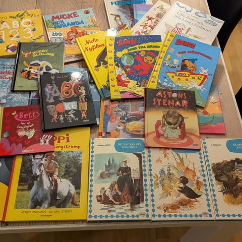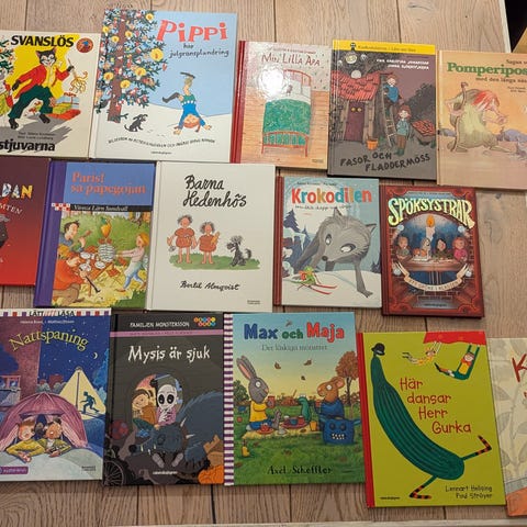 Säljer ett paket med 7 barnböcker enligt bild. Blandade böcker i olika format – perfekt för högläsning och att fylla på bokhyllan.