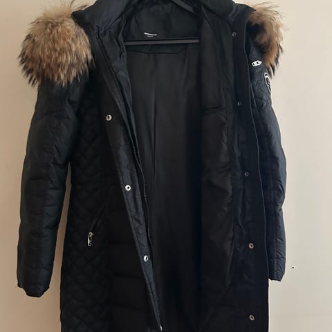 Svart dunjacka med dragkedja och knappar framtill. Jackan har två fickor med dragkedja och två utan. Luvan har en en stor äkta pälskrage. Har en logotyp på vänster ärm.