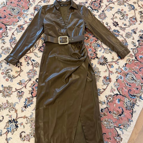 Svart klänning med långa ärmar och skärp i midjan. Klänningen har en krage och knäpps omlott. Använd enstaka gång. I PU-läder.