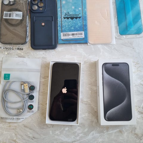 Dax att sälja min och fruns Apple iPhone 15 Pro Max smartphone med 256 GB lagringsutrymme.