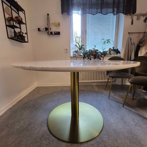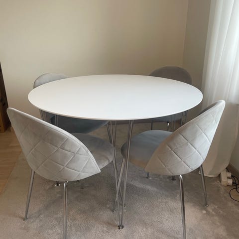 Runt matbord med marmoreffekt och svart metallstomme från Mio. Fyra beige klädda stolar med mjuk stoppning och rundade ryggar också från Mio. Nästan tre år gammal i mycket gott skick