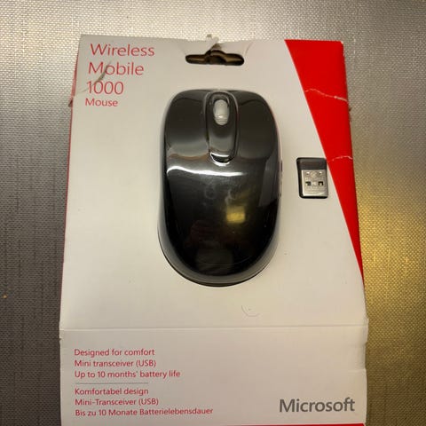 Microsoft trådlös mus i svart färg. Musen är utformad för trådlös användning och har en enkel design med två knappar och ett scrollhjul. Passar för allmän datoranvändning.