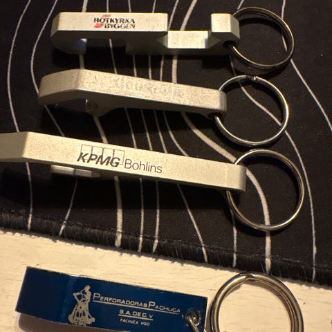FPI nyckelring med flera öppnare i olika färger. Tillverkad i metall och plastmaterial. Passar för nycklar och som verktyg för att öppna olika typer av lock eller förpackningar. fem nyckelring