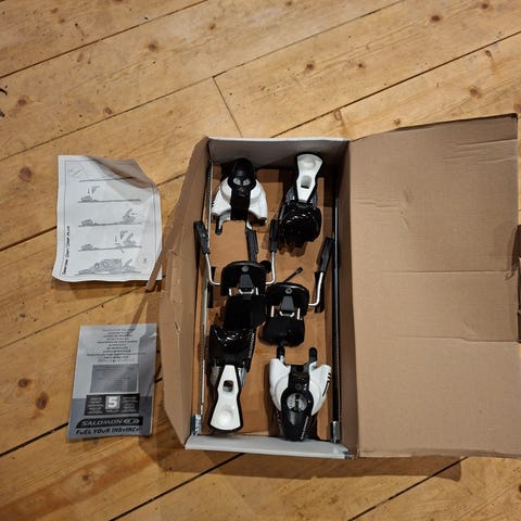 Bindningarna är fortfarande i originalförpackning och har aldrig varit monterade eller använda. Justering av DIN och montering bör göras i skidverkstad för att garantera säkerhet.