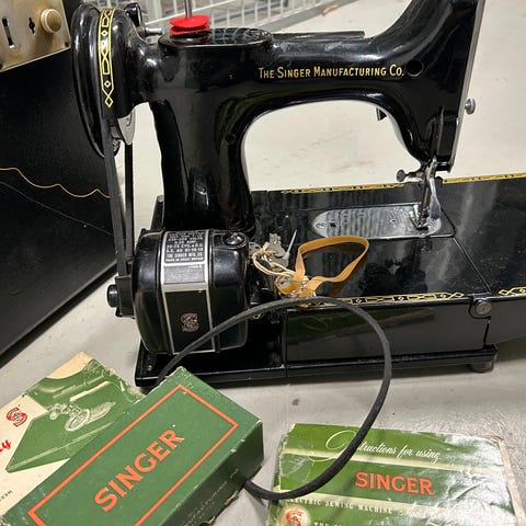 Fungerande gammal symaskin från Husqvarna på trästativ. Perfekt om du vill sy klart när du får strömavbrott. Sliten på skivan, annars i gott skick.