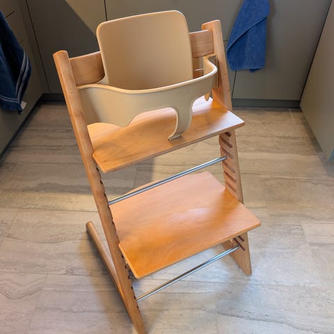 Stokkes ikoniska barnstol Tripp Trapp, i klassiskt utförande i klarlackat ljust bokträ. Senaste modellen (tillverkningsår 2019) och kompatibel med alla de moderna baby-tillbehören, som newborn set, ryggstöd, plastbygel/bricka.