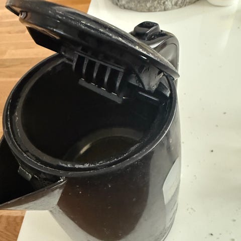 vattenkokare med behållare i glas och detaljer i svart plast. Utrustad med handtag och lock i svart, samt en bas med strömkabel. Passar för uppvärmning av vatten i hushåll.