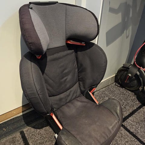 Maxi-Cosi Rodifix Bilbarnstol. Framåtvänd för barn upp till 36 kg. Grå och svart med röda detaljer. Stolen har justerbart ryggstöd och växer med barnet.