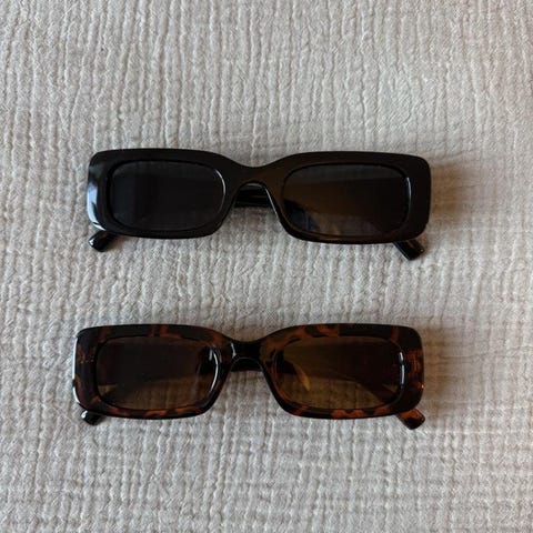 Nividas solglasögon med oval form i beige färg. Glasögonen har mörka linser och en ram med marmorerad beige design.