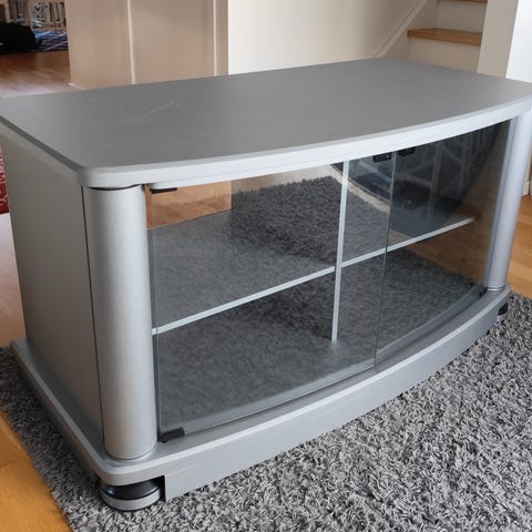 Praktisk TV-bänk i ljust trä med skåp och lådor för förvaring.