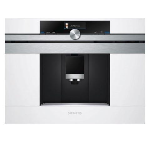 Electrolux Husqvarna inbyggd kaffemaskin i rostfritt stål. Maskinen är integrerad för inbyggnad i köksskåp och är utrustad med flera funktioner för kaffebryggning, inklusive en kanna i rostfritt stål och en mjölkskummare. Kontrollpanelen med touchknappar.