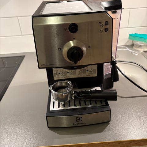 AEG EA 130 espressomaskin i silver. Utrustad med brygghållare, ångmunstycke för skumning av mjölk och avtagbar vattenbehållare. Drivs med 220-240V och har en effekt på 50/60 Hz. Fungerar som den skall vid test.