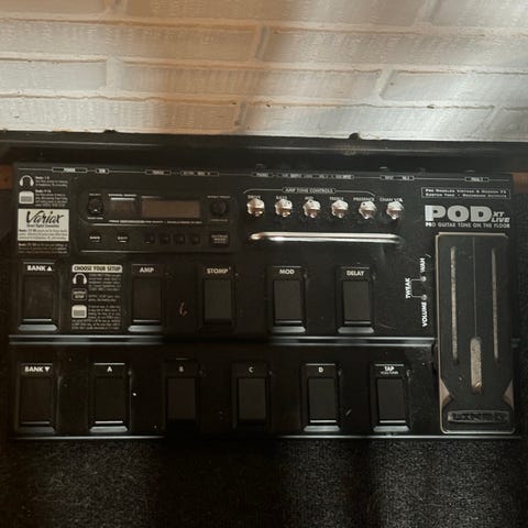 Line 6 POD Go är ett gitarrtillbehör med flera knappar, rattar och en expression pedal. Den har en display för inställningar och anslutningar på sidan för olika ljud- och effektinställningar.