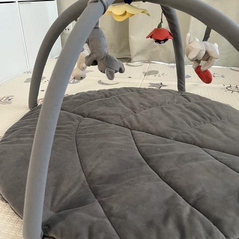 IKEA babygym i grått tyg med mjuka hängande figurer i olika färger och former. Använd men i bra skick.