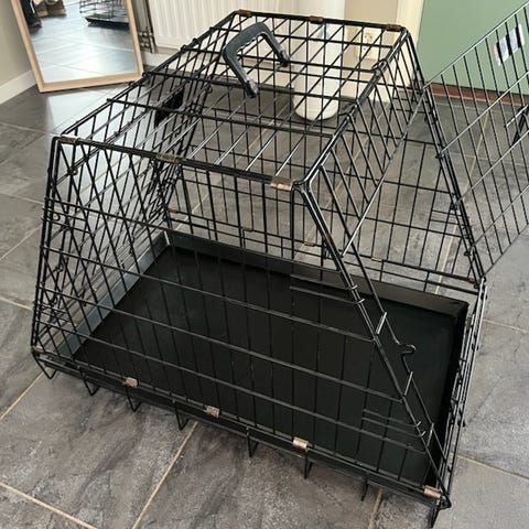 Lätt och stabil hundbur av aluminium och MDF. Sluttande fram och baksida för att passa bra i bilens bagage. Gallerförsedd för att ge hunden god ventilation och bra utsikt. Lätt att hålla ren.