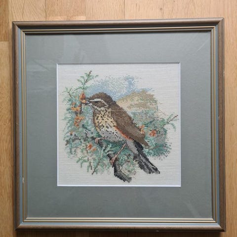 Säljer denna tavla med guldram och korsstygn som gått i arv i familjen. Tyvärr så är skicket inte perfekt, se bilder där glaset gått sönder, det är gamla skador. Trots allt är tavlan mycket vacker när den hänger på rätt ställe. Jag har haft den med en samling religiösa motiv. Den har varit en kär ägodel.