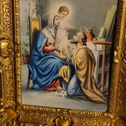 Antik Tavla korsstygn Jesus Maria stor guldram