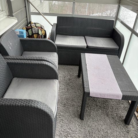 Soffa, pallar, bord och matta i mycket fint skick säljes i ett paket