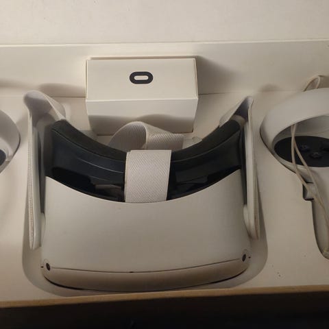 Oculus Quest 2 VR-headset. Inkluderar headset, två handkontroller och nödvändiga kablar för PC-anslutning och laddning.