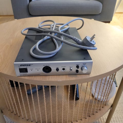 Bose ljudprocessor med flera reglage och en digital display. Enheten har en svart färg och är utformad för ljudhantering och justering. Den har kontroller för volym och olika ljudinställningar. Säljes med väska och sladd samt skyddsfodral