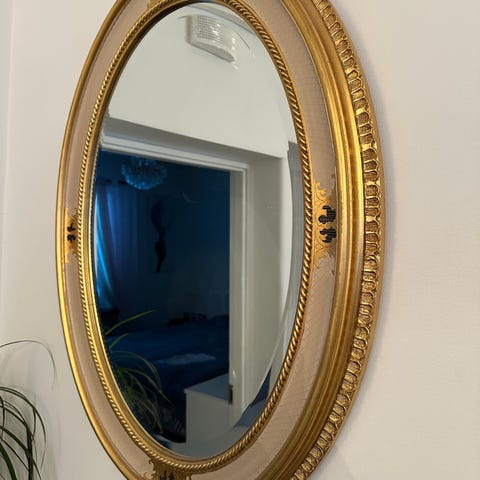 Stilren bågformad spegel i två separata delar, svart metallram med spröjs.