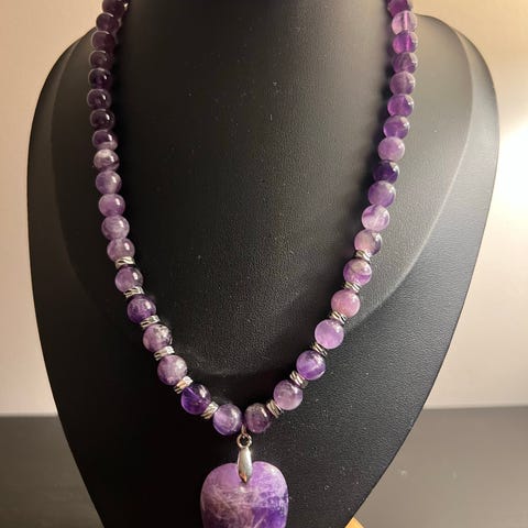Detta exklusiva ametisthalsband utstrålar sofistikerad elegans och naturlig lyx. Ametistens djupa lila toner skiftar vackert i ljuset och ger smycket en fängslande lyster som aldrig går ur tiden. Varje sten är unik och bidrar till halsbandets exklusiva karaktär.