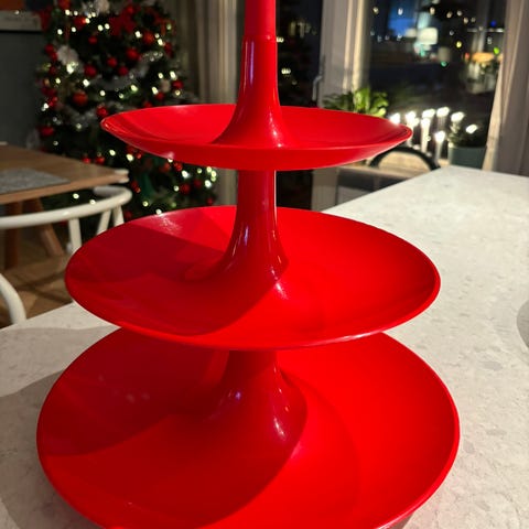 Vitt våningsfat i blank plast som enkelt kan monteras ihop. Vissa repor och viss avfärgning under efter förvaring.