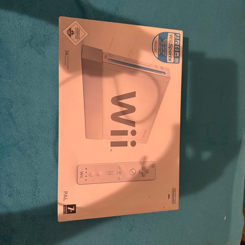 Nintendo Wii spelkonsol med tillbehör inklusive kontroller, sensorer och olika spel. Konsolen är kompatibel med Nintendo Wii-spel och erbjuder interaktiv underhållning för flera användare.
