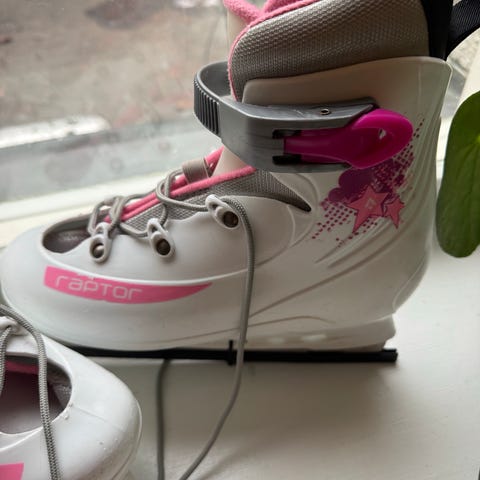 Raptor skridskor för barn i storlek 34. Skridskorna är vita med rosa detaljer och har snörning och justerbart spänne för bättre passform. De är avsedda för allmän skridskoåkning och har en robust konstruktion för barnets komfort och säkerhet.