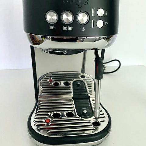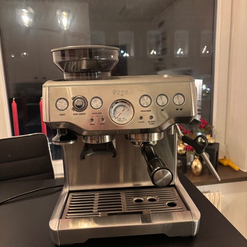 Sage espressomaskin i rostfritt stål med flera kontrollknappar och inbyggd kaffekvarn. Maskinen är utformad för att brygga espresso och har en ångstav för mjölkskumning.